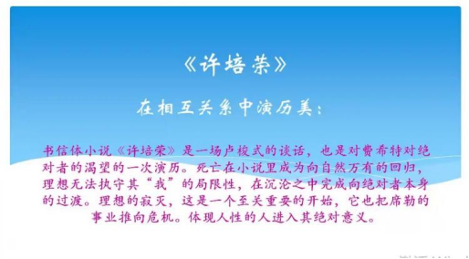 此次讲座主要讲解了他的小说《许培荣》,这部小说在艺术形式上模仿了卢梭书信体小说《许培荣》中的语言充满了生命力,是在日常生活中难以获得的宝贵经验。