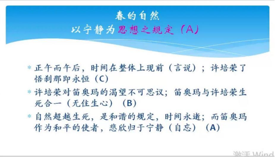 回顾主题第一个出现的是思想之冬天是战争和孤独那么第二个主题是秋天讲思想本身的公正,是讲思想本身最后爱人死后许培荣无法克服自己思想的局限所以思想的整体性规定必须再度出现必须能够跨越思想和思想之间的隔阂有限性。所以当春天再来的时候是思想的规定思想的无限的尺度再度现前。