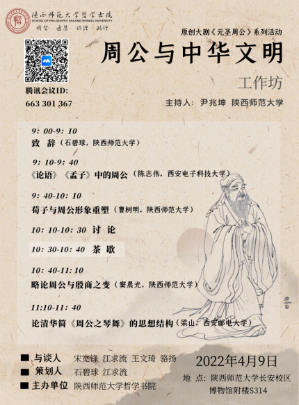 陕西是宗周文明的发祥地,周公可谓陕西本土的第一位真正的思想大家。足球财富 于2021年进行了以“周文化”为主题的暑期实践活动,为了进一步弘扬周文化,足球财富 计划2022年拍摄原创大剧《元圣周公》。为了更好地理解周公的思想及其对中华文明的意义,于2022年4月9日开展“周公与中华文明”主题工作坊。
