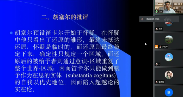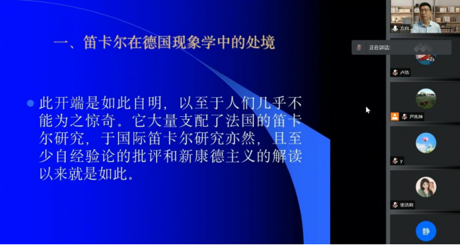 20224月157点,西方近代形而上学系列讲座第二讲——“论笛卡尔在德国现象学中的处境以及马里翁的不满”于线上顺利开讲。本次讲座由中山大学哲学系教授方向红主讲,陕西师范大学哲学系教授赵卫国主持,来自学校各学院计千余名师生在云端聆听本次讲座。