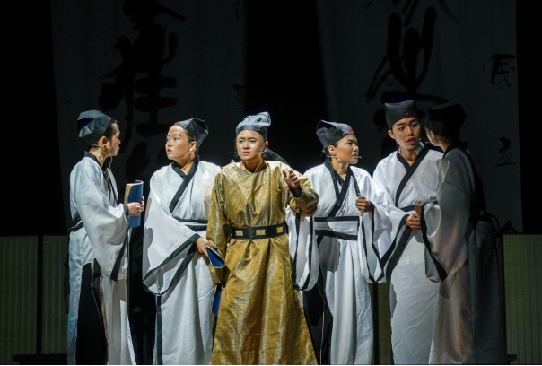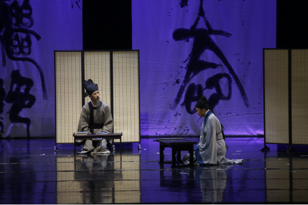 剧分四幕。开场之前,一束昏黄的“时间之光”缓缓亮起,青年张载与老年张载于光影翩跹之中跨时空相见,大儒的历史开始缓缓落笔。第一幕《范希文知仁御敌于外 张子厚开蒙退读中庸》,呈现的是张载青年时期幸得范仲淹开蒙,退读《中庸》,权舆三教,返归六经的经历,本幕以“儒者自有名教可乐,何事于兵?”为题眼,在张载与范仲淹的对话中,为本剧揭开北宋中期外部秩序方安,内在文化臻盛,然政治思想依旧面临双重困境,政教失坠,民心难安的时代背景。