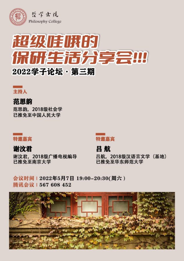3.本次分享会偏重分享人文社科类专业的保研经历。坊主及嘉宾将结合自己的保研经历,分享本专业的保研经验及跨保其他人文社科专业的经验,帮助学弟学妹了解心仪院校与专业的保研流程,梳理院校和专业/方向选择的思路。