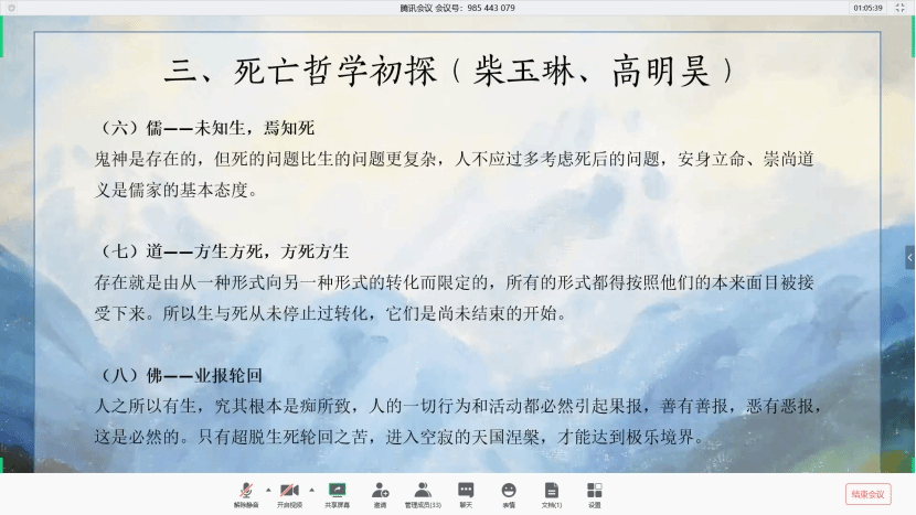 第一部分为对苏格拉底生死观的阐释,四点主要内容分别为美德高于死亡、人民对城邦与法律的服从、听从神谕与死亡的归属;第二部分是对其观念的评价及意义,苏格拉底是一个虔诚的理性主义者、也是践行城邦民主的殉道者和超脱生死的道德主义者;第三部分为死亡哲学初探,小组成员通过查阅文献资料,梳理了古今中外一些哲学家对死亡的看法与态度,如柏拉图、经院哲学家、康德、海德格尔、以及东方的儒家、佛教,我们如何认识死亡、如何向死而生,是哲学中经久不衰的终极话题。