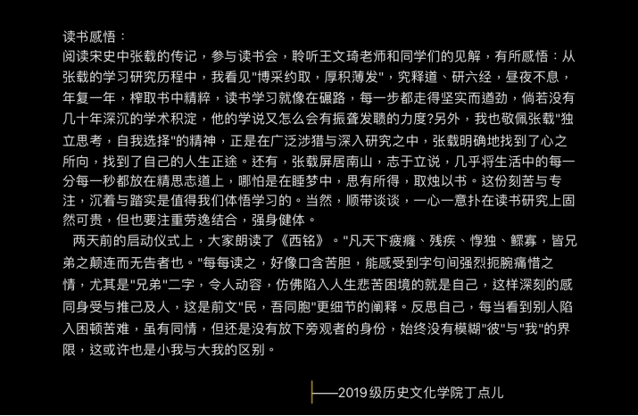 通过这次分享会,同学们对张载的入仕生涯、为政事迹、遭逢经历等有了初步的了解;对张载其人、其学的形成与发展,有了基本的认知;对张载“形上道德”和“具体工夫”的双重世界产生了深入探索的兴趣。