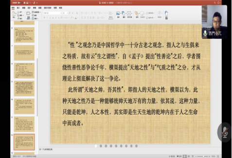 窦老师从乾坤父母、吾体吾性、民胞物与、存顺没宁四个角度对《西铭》逻辑结构和内容进行分析,带领同学们体会张载哲学思想中恢弘壮阔的宇宙精神和民胞物与的济世情怀。同时,窦老师补充了乾、坤二者的关系,“天地之性”与“气质之性”之分,民胞物与的泛爱与儒家等差之爱之间的关系等问题,便于同学们理解宏大抽象的宇宙精神。