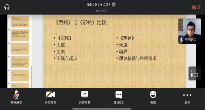 《西铭》揭示了张载基于宇宙根源的哲学的伦理架构,亦反映了其终极追求,而《东铭》则为其实践上的起点。同学们通过本次分享会,了解了张载思想的宏观理念与现实起点,进一步感受到关学精神的现实意义和宝贵的价值。希望每位参与的同学都能学有所得,学有所悟。