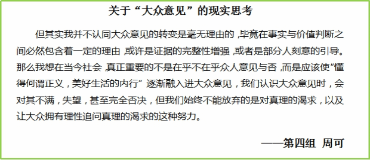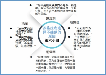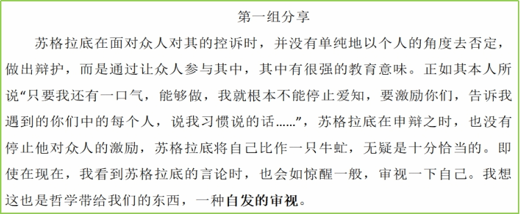 在每日轮值小组的带领下,同学们围绕《申辩》和《克力同章句》提出诸多问题,展开有序的讨论。基于理性的思考和包容的态度,来自不同专业的同学得以对自己的观点进行阐发和辩护,思想碰撞的火花也得以闪烁其光。各小组的阅读心得形式多样、角度各异,在经过审慎思考和仔细求证后对苏格拉底之死引发的一系列问题作出了进一步的回答。概言之,心得主要围绕“死亡”、“真理、“哲学与政治”等几个关键词进行阐述,或将哲学问题放在与政治领域交叉的视域下进行考察,或将苏格拉底与孔子、阿基琉斯等人进行横向比较,内容异彩纷呈,文字与思想交融得以激荡人心。