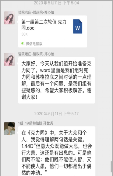 本次读书会选取的文本,兼顾了经典性、思想性和可读性,在这两部篇幅不长的著作中,几乎可以看到哲学与政治、道德与法律、意见与真理、自由与民主、自我与社会、服从与反抗等道德和政治领域的所有问题,同学们将通过文本的深入分析,尝试性地形成自己对”苏格拉底之死“这一西方历史最为重要的政治事件的恰当理解。随后书院制定详细的活动方案,组织招募成员,以课程群和学院群为单位共形成11个读书小组。在开读之前,书院强调读书会的规则,要求各小组根据老师指导研读指定内容,保持进度一致。每周每人须提交一篇读书心得,以小组为单位汇总成一篇,在固定时间由老师在线上带领大家共读及讨论,并抽取几个小组的读书心得进行点评,同时每天由一个小组在群里轮值进行交流分享。