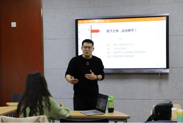 沙龙伊始,王老师先抛出问题:中国为什么被称为礼义之邦?在对礼仪的基本社会功能及其与西方文化间的不同简单对比后,王老师从四个方面开始了沙龙内容。第一部分以“‘射礼与君子之‘仁义’”为主题。同学们以专门研究传统礼仪的著名学者彭林教授的观点为参照,体会“射礼中蕴含有华夏特有的人文体育精神”——与古希腊强调力量、速度、高度、技巧的竞争的体育精神不同,儒家认为只有在健全的精神的前提下,体魄和技能才有价值。儒家十分讲究“质胜文则野,文胜质则史,文质彬彬,然后君子”,并且以“射者,所以观盛德也。是故天资以射选诸侯、卿、大夫、士”来把握射礼之“观德”的深意。