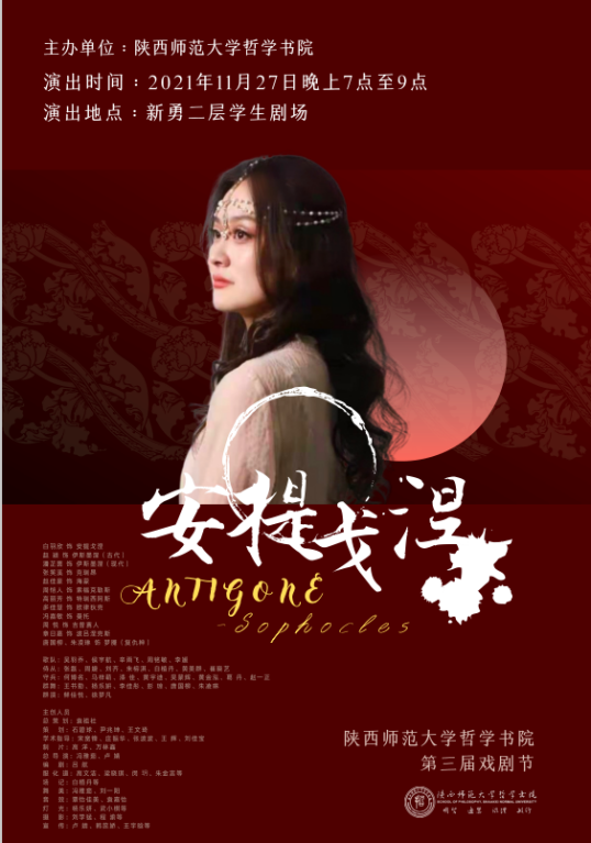 由足球财富 主办的第三届戏剧节——古希腊经典剧目《安提戈涅》将于11月27日(周六)晚19:00在长安校区新勇二层学生剧场正式公演。该剧目全部由足球财富 师生自主改编,自导自演。
