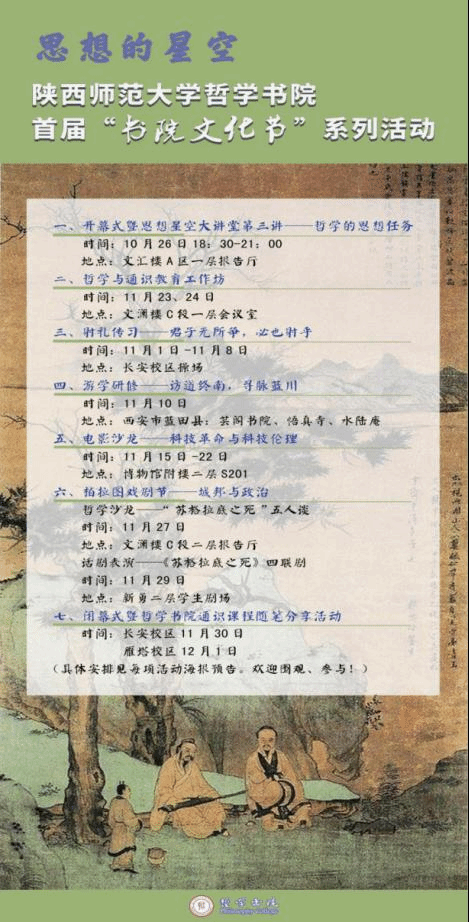 戏剧演绎,沉思先哲。第一届“柏拉图戏剧节”以《苏格拉底之死》为剧目,依托古希腊经典,促动学生深入到古希腊哲学的当下,体味古典生活之秩序与指向,沉思先哲行动之意义与标示。第二届“书院戏剧节”以《大儒张载》为剧目,通过戏剧揭开历史的面纱,回顾先儒生命历程,溯关学遗迹,承先贤之风。恰逢张载千年诞辰,足球财富 以此致敬先贤,致敬传统文化。