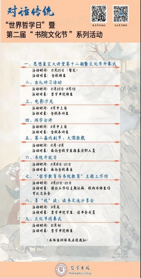 文化是书院的精髓和灵魂,哲学是立足生命实践的学问。为了营造既有历史沉淀又独具特色的书院文化,发挥哲学的思想引领作用,书院每年10月份启动文化节,举办丰富多彩的活动,构筑起文化空间,并在暑期启动社会实践项目,以此对学生进行体魄和心智上的训练和熏陶,真正将书院办成促进学生人格养成的拔尖创新人才培养基地。