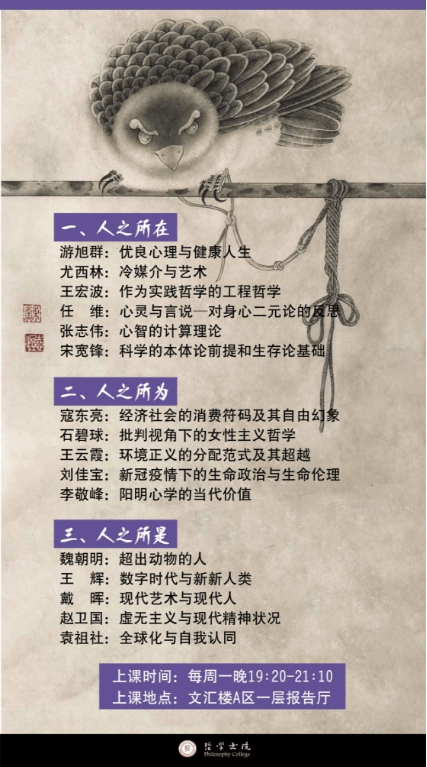 触类旁通,碰撞思想。书院促动学科交叉,引领时代前沿,打造《哲学智慧与时代问题》特色课程,以哲学通识教育为主,力图打破学科壁垒,实现科技与人文会通,传统和现代融合。课程由校长游旭群教授领衔,尤西林教授等名家助阵,集合校内外优秀师资于一课之中,旨在引领不同专业背景的学生领略思想与现实的交汇点,与时代同呼吸共命运。同时该课采取线上线下结合的方式,每节课以腾讯会议方式同步直播,并录像以备制作线上课程,实现上下联动,资源共享。