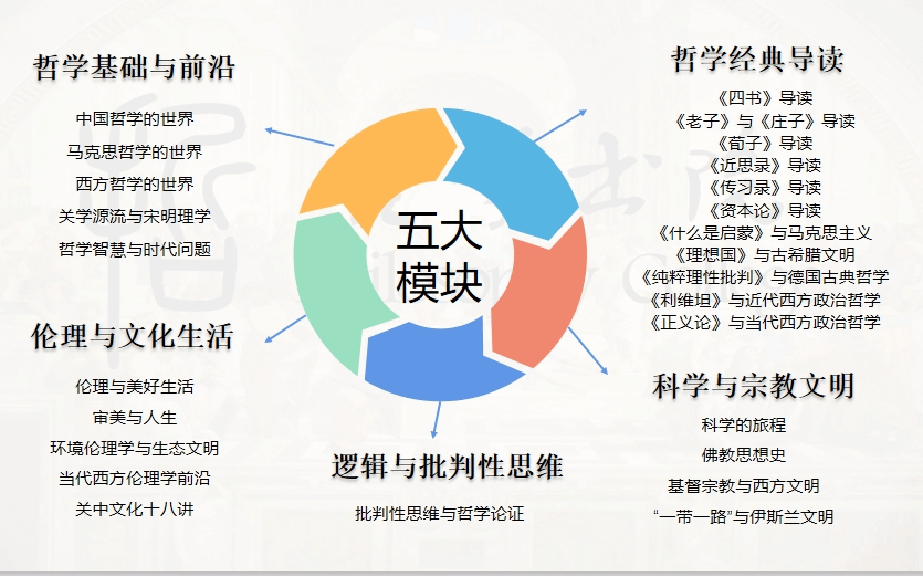 五大模块,构筑体系。书院为非哲学专业的学生打造特色鲜明的哲学通识教育模块,提供“哲学基础与前沿、哲学经典导读、伦理与文化生活、逻辑与批判性思维、科学与宗教世界”五大模块共27门通识核心课程,更多课程正在建设中。加盟书院的学生将接受系统的哲学通识课程教育,通过健全心性修养、优良德性养成和卓越思维训练,形成特定的哲学态度和气质,成为兴趣丰富、人格完整、头脑健全的通识人才、思辨型人才,拓展和提升在原有专业的发展空间与层次。