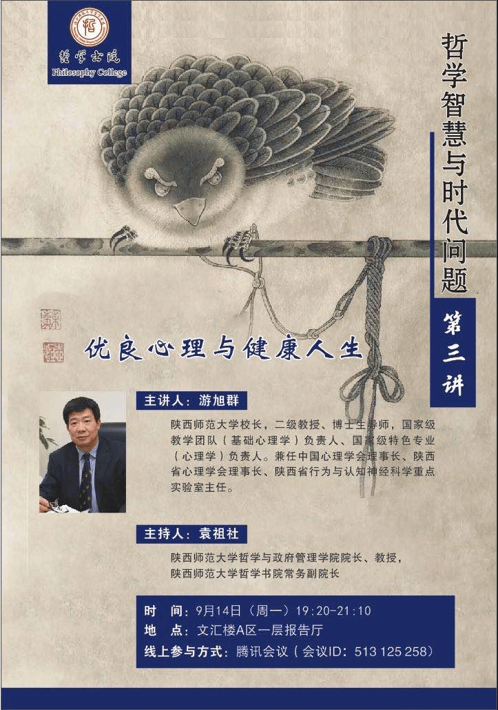 主讲人介绍:游旭群,陕西师范大学校长,二级教授、博士生导师,国家级教学团队(基础心理学)负责人、国家级特色专业(心理学)负责人。兼任中国心理学会理事长、陕西省心理学会理事长、陕西省行为与认知神经科学重点实验室主任。