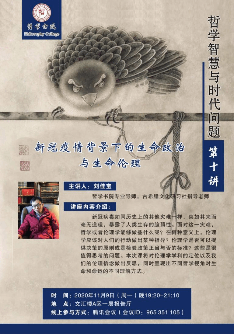 内容介绍:新冠病毒如同历史上的其他灾难一样,突如其来而毫无道理,暴露了人类生存的脆弱性。面对这一灾难,哲学或者伦理学能够做些什么呢?在何种意义上,伦理学应该对人们的行动做出某种指导?伦理学是否可以提供决策的原则或是检验政策正当与否的标准?这些是很值得思考的问题。本次课将对伦理学学科的定位以及我们的伦理信念做出反思,同时呈现出不同哲学视角对生命和命运的不同理解方式。