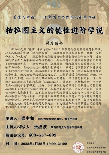 荷马时代用“德性”来表达诸如“勇敢”等最具价值的共同规范和品性;后来苏格拉底宣称“德性即知识”;柏拉图则明确表达智慧、勇敢、节制和正义“四主德”;亚里士多德在道德德性和理智德性上作出分野,突出实践智慧在人类事务领域内的重要性。新柏拉图主义学派的哲学家又开辟了新的阐释方式——德性等级说。众所周知,新柏拉图主义的特点之一是融贯和综合,在德性论这一问题上也不例外。不同于过往哲学家试图在定义上对德性进行解读,新柏拉图主义者们则放眼寻求一种涵盖各种解释的综合体系,因此德性等级说应运而生了。从普罗提诺(Plotinus)开始,一直到古代末期,德性等级说都被不断地充实着,经过演变和发展,这一理论甚至还通过马克洛比乌斯(Macrobius),传递到了包括托马斯·阿奎纳在内的经院哲学家那里。然而,尽管当今欧美世界对于柏拉图主义甚至新柏拉图主义的研究已然较为繁荣,各类原著类注疏、论丛比比皆是,国内相关译作也愈渐丰富,且不乏以某位古代柏拉图主义者为中心或以其某方面的思想为议题的专著。但事实上却鲜有以新柏拉图主义德性观为议题的伦理学研究,即便是在伦理学方面的导读性文本或著作中,成体系的新柏拉图主义德性观也并未受到更多关注。本次讲座即介绍柏拉图主义者视野中的德性等级学说,以便大家更多关注这一领域的理论内容和贡献。