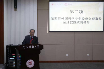 大会闭幕式由陕西师范大学哲学系副主任庄振华教授主持。西安交通大学王嘉新副教授作总结发言,他介绍了各小组讨论的大致情况,并指出,本届年会对西方近现代哲学研究的各个领域展开了广泛而深入的研究讨论,体现了陕西外国哲学研究界的整体水准和活跃面貌。陕西省外国哲学专业委员会理事长金延教授随后致闭幕辞,他首先对本届年会所取得的丰硕成果给予了高度评价,并鼓励在陕学者积极奋取,在外哲研究领域取得更卓著的成就,最后祝贺本次大会取得圆满成功。