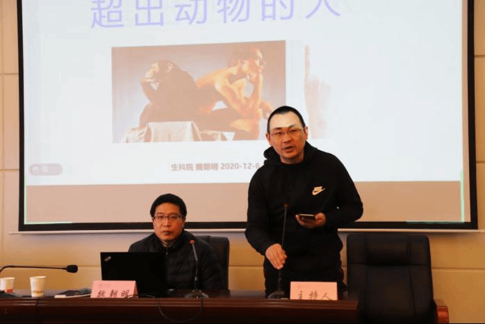 12月7日晚19:20,“哲学智慧与时代问题”第十三讲于文汇楼A段一层报告厅开讲。本次讲座是由陕西师范大学生命科学学院副教授魏朝明带来的“超出动物的人”,讲座由王辉老师主持,并通过“腾讯会议”全程直播,百余名听众通过线上线下参与了本次讲座。