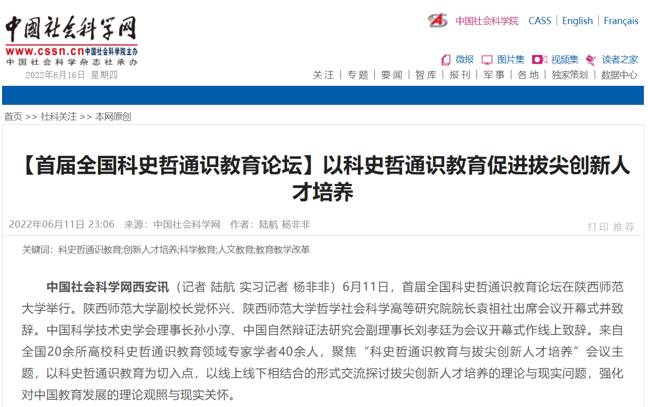 6月11日,首届全国科史哲通识教育论坛在陕西师范大学举行。陕西师范大学副校长党怀兴、陕西师范大学哲学社会科学高等研究院院长袁祖社出席会议开幕式并致辞。中国科学技术史学会理事长孙小淳、中国自然辩证法研究会副理事长刘孝廷为会议开幕式作线上致辞。来自全国20余所高校科史哲通识教育领域专家学者40余人,聚焦“科史哲通识教育与拔尖创新人才培养”会议主题,以科史哲通识教育为切入点,以线上线下相结合的形式交流探讨拔尖创新人才培养的理论与现实问题,强化对中国教育发展的理论观照与现实关怀。