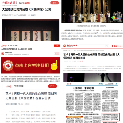 截至目前,《大儒张载》公演活动先后在中国新闻网、人民日报客户端、中国青年网、中国文化传媒网、文旅中国、陕西日报、陕西教育新闻网、三秦都市报、西安日报、西安晚报等多家媒体平台报道。