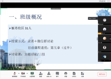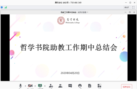 首先由本学期的13位课程助教分别进行工作汇报,主要集中在四个方面:课程进展情况、平台使用情况、学生学习情况以及第一次研讨课的相关情况。在汇报中助教们分享他们工作中可供借鉴的经验:《批判性思维与哲学论证》课程助教朱家政提出在讨论课的评价方面可以采取小组互评的方式,增加公正度和公平性;《中国哲学的世界》课程助教李东升建议在线上教学的开展过程中,应多了解学生情况,给予学生人文关怀;《马克思哲学的世界》课程助教侯雪微指出腾讯会议平台在了解学生学习进度方面很便捷有效,而Blackboard平台则容易保存学生稿件等材料方便老师查阅;《伦理与美好生活》课程助教叶啸雨在谈道他本次开展讨论课遇到冷场情况时,建议下次可以采取辩论方式以活跃气氛;《〈老子〉与〈庄子〉导读》课程助教王乐分享其本次讨论课开展前专门进行一次原著赏读课,对于讨论的开展大有助益;《青年马克思的“经济学-哲学”智慧》课程助教张佳璇提出学生在讨论课中容易出现问题较散且浮于表面的情况,建议可以由小处入手,从文本入手,引导学生言之有物;《〈四书〉导读》课程助教朱斯琴则谈到批阅学生讨论稿时出现的引文不注出处的问题,建议学生成文注明参考文献,养成良好的写作习惯。