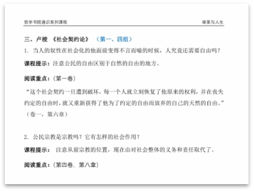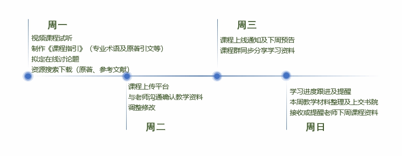 每周课程筹备及发布时间线大致如上,收到老师录制好的视频课件后试听并制作《每周学习指引》,主要内容覆盖专业术语、原著出处及思想时代背景等,帮助跨专业同学更好地适应哲学课程的学习。同时,收集并与老师确认相关阅读书目、参考文献等电子版学习资源,商讨拟定在线作业题。将所有教学资料上传平台,与任课老师确认无误后,在学习群发布本周课程信息及下周课程预告。