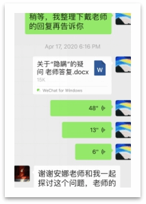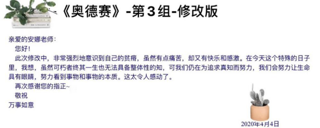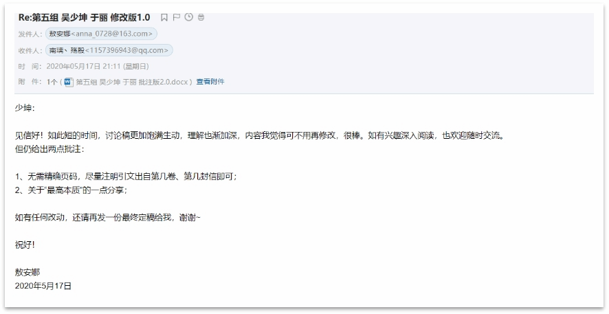 其次,在批复讨论稿初稿修改意见的过程中,对于自己无十足把握的问题,先从相关课程内容中摘取老师的讲述供学生改稿参考,进而再直接向老师求教,并将老师的答疑整理后反馈给相关同学。