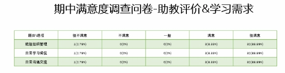 为了更好地提升助教工作质量,在进行期中课程满意度匿名问卷调查时,设置“助教评价”板块,并采集与助教工作相关的需求及建议。