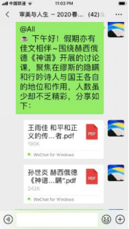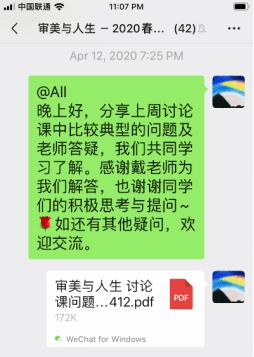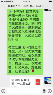收到同学们的讨论稿修订版后,于讨论课前两到三日分享到所属讨论组并组内指定点评人。供大家提前熟悉组员讨论内容的同时,也在一定程度上保证讨论课上同学们的关注度和参与度。