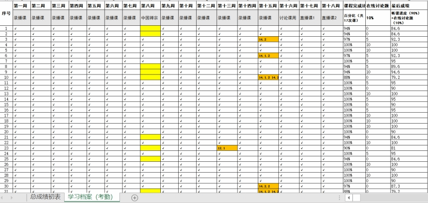 为了方便同学们灵活安排课程学习及回顾,录播课程上线后将持续开放。为了避免出现课程积压、 学习进度滞后等不良状况,助教于每周末查看统计超星平台学习数据,并制作了《学生学习档案》用于日常学习督促及期末评分参考。